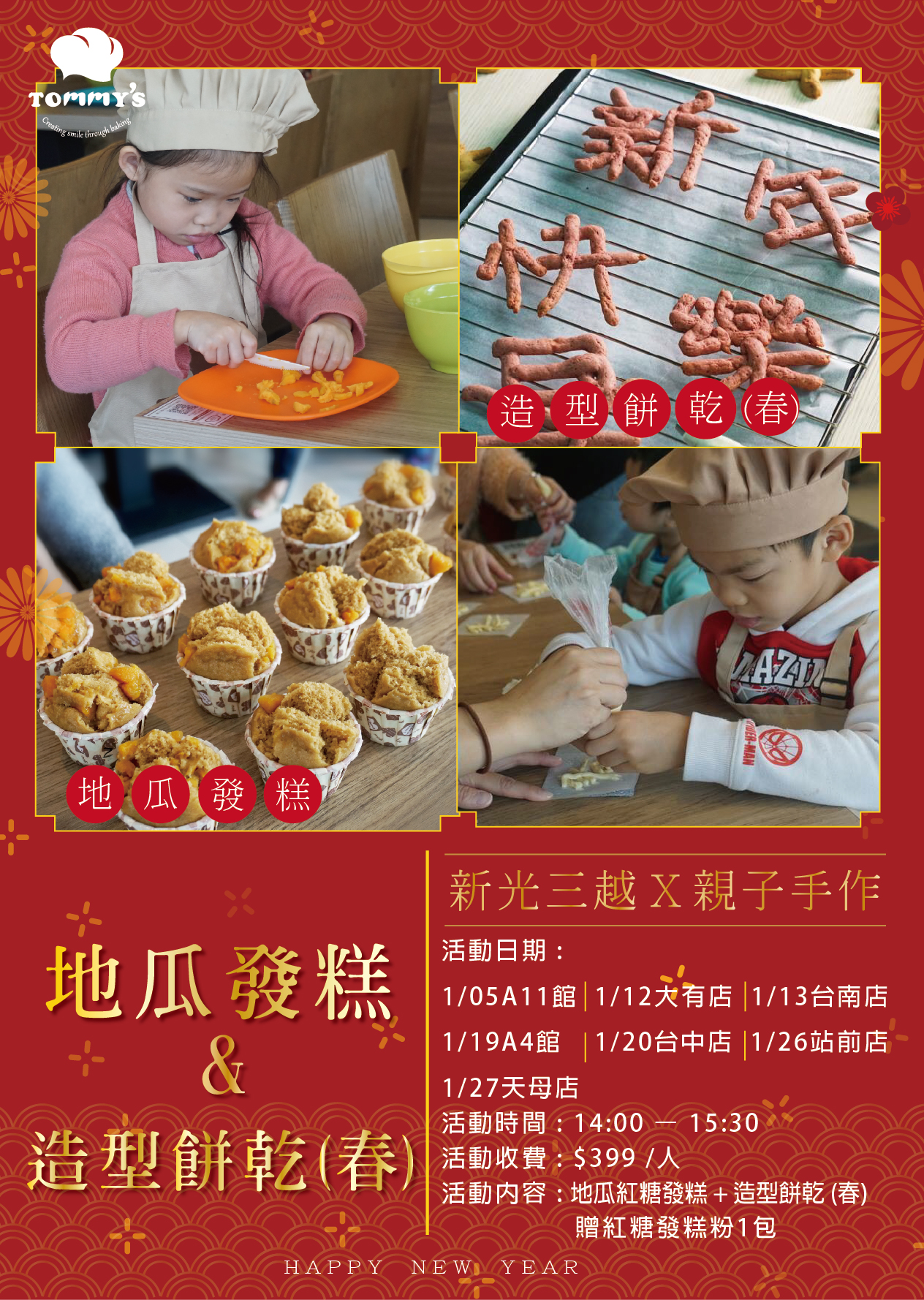 藉由年節,讓孩子體驗傳統文化的溫度,從中獲得烘焙的樂趣 現場教學地瓜發糕及春字造..