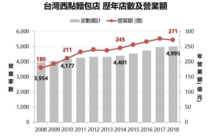 根據財政部統計,台灣西點麵包店在 2018 年已有將近 5000 家,和 10 年前相比,店數成長了 25%。 這樣的營業密度,已經逼近 7-11 在台的門市數量,也代表在台灣你每看到 3 間便利商店,就能看到 1 家西點麵包店。
