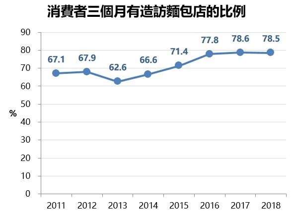 從營業額的成長速度來看,這 10 年來增加了 50%,增幅遠大過營業店數增加的速度,凸顯了台灣消費者近年來飲食方式的改變。尤其是從 2013 年後,近三個月消費者到訪麵包店的比例逐年上攀,都展現了更多的麵包店成功創造更多消費者對於麵包的喜愛。