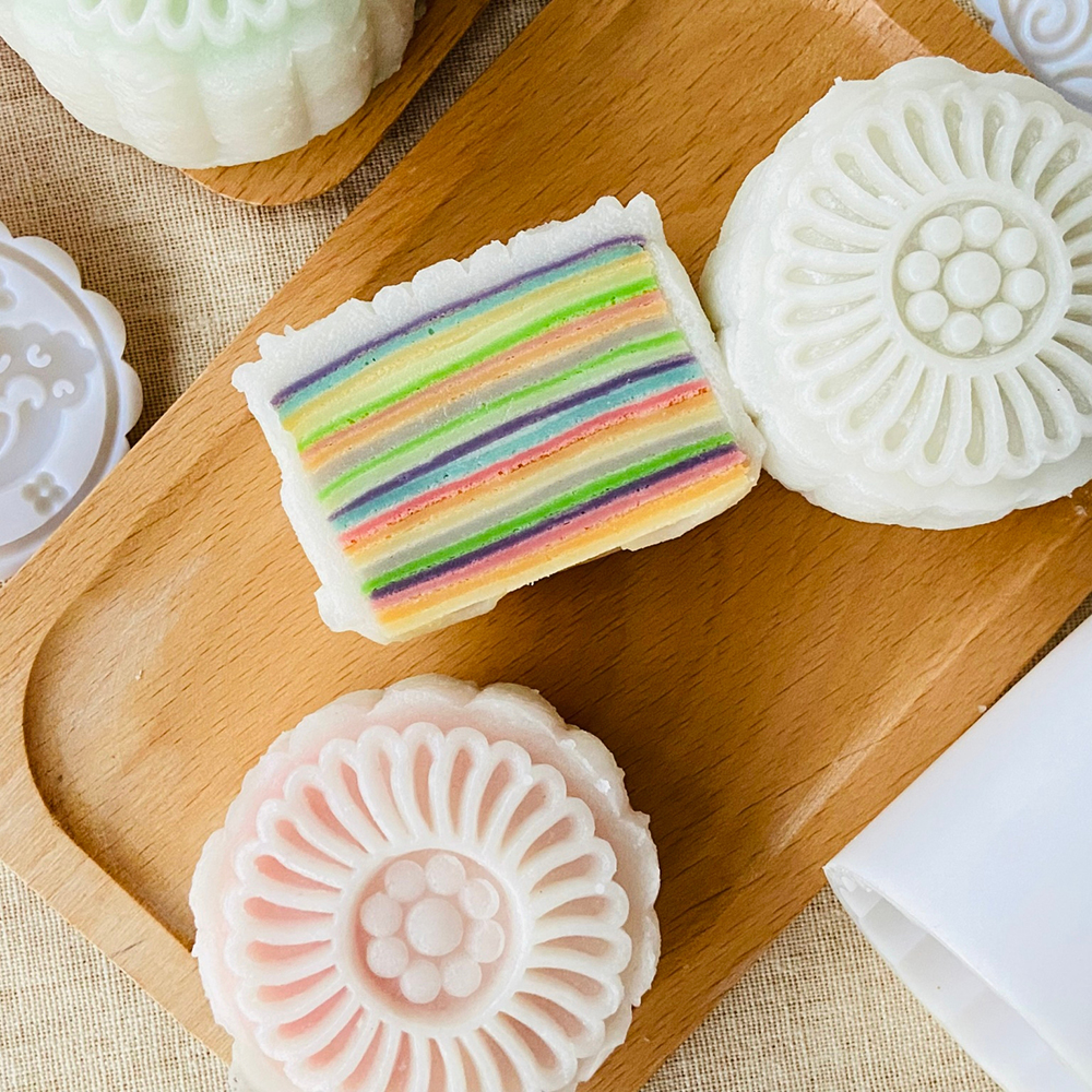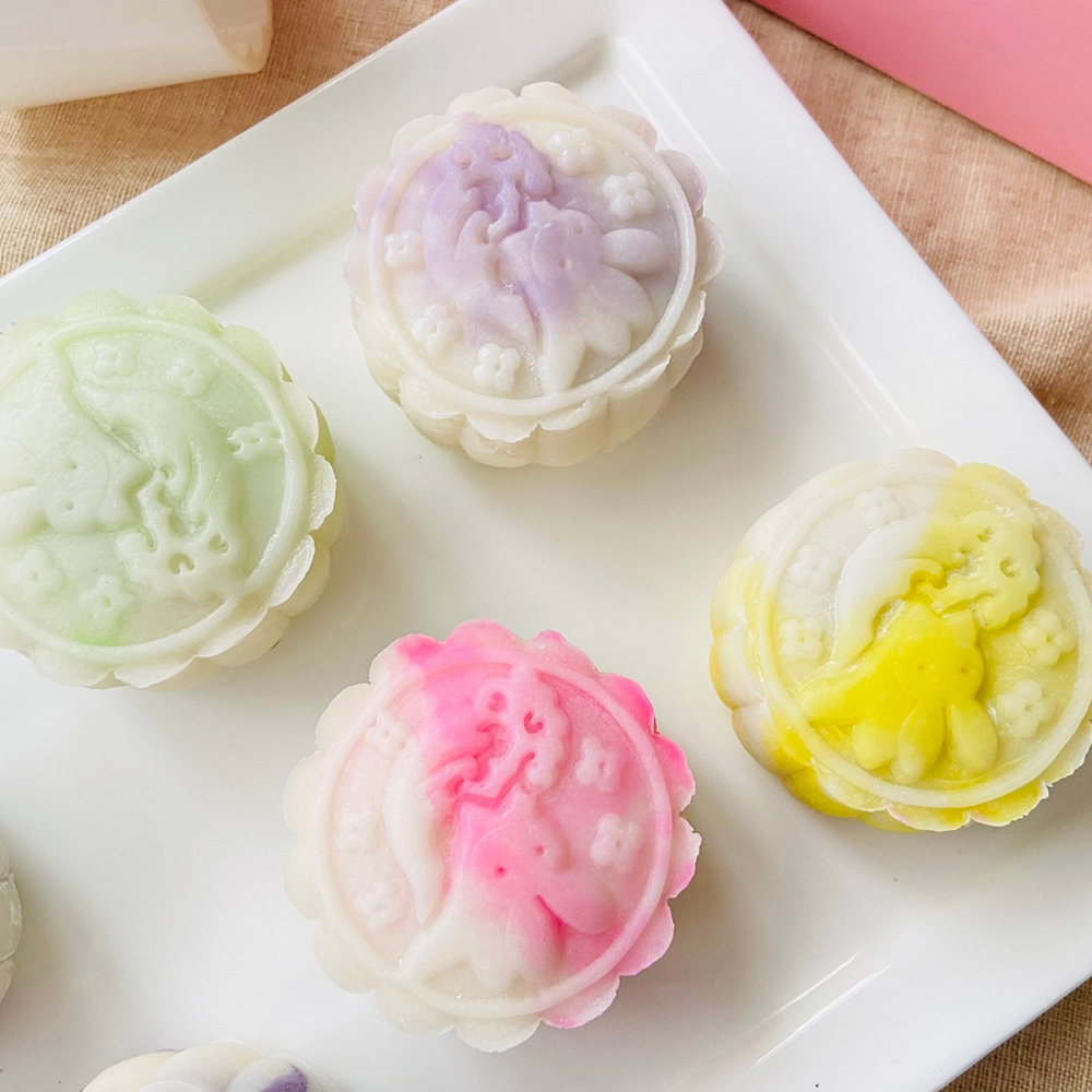 課程內容有花漾暈染冰皮、水晶月餅、金柚玉兔、彩虹千層冰皮月餅喔~(如下圖)