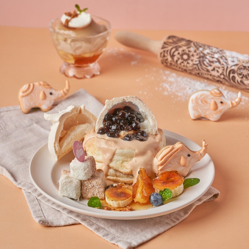 入口感受泰奶醬濃郁滋味與杏仁脆片、黑糖珍珠帶來的多層次口感,每一口都驚喜滿滿,一旁擺上焦糖炙燒水果和泰式雪花糕,吃一口宛如一秒到泰國啦!