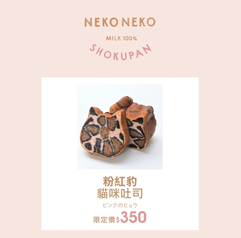 為了歡慶Grace Gift敦南概念店的開幕,Neko Neko Shokupan特地在台灣推出最新限定口味「粉紅豹貓咪吐司」,以不添加一滴水並且使用進口北海道鮮奶製作,這次將巧克力可可粉與草莓丁巧妙融合成如同豹紋般萌趣圖案。