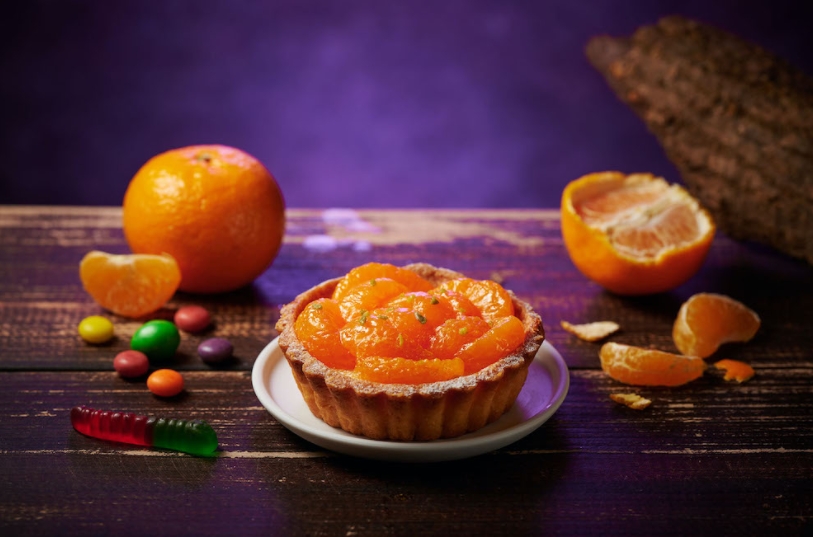 「八腳怪橘乳酪塔」(79元)使用蜜柑柑橘瓣,果肉肥厚飽滿,多瓣的橘子果肉猶如八腳怪的外型,內餡以檸檬奶佐輕柔的乳酪慕斯,搭配微酥法式沙布列塔皮,上層鋪上8~10片橘瓣點綴,清爽酸甜;而「橘凍布丁」(55元)風味滑順又帶著橘子清香,勢必成為小朋友首選。