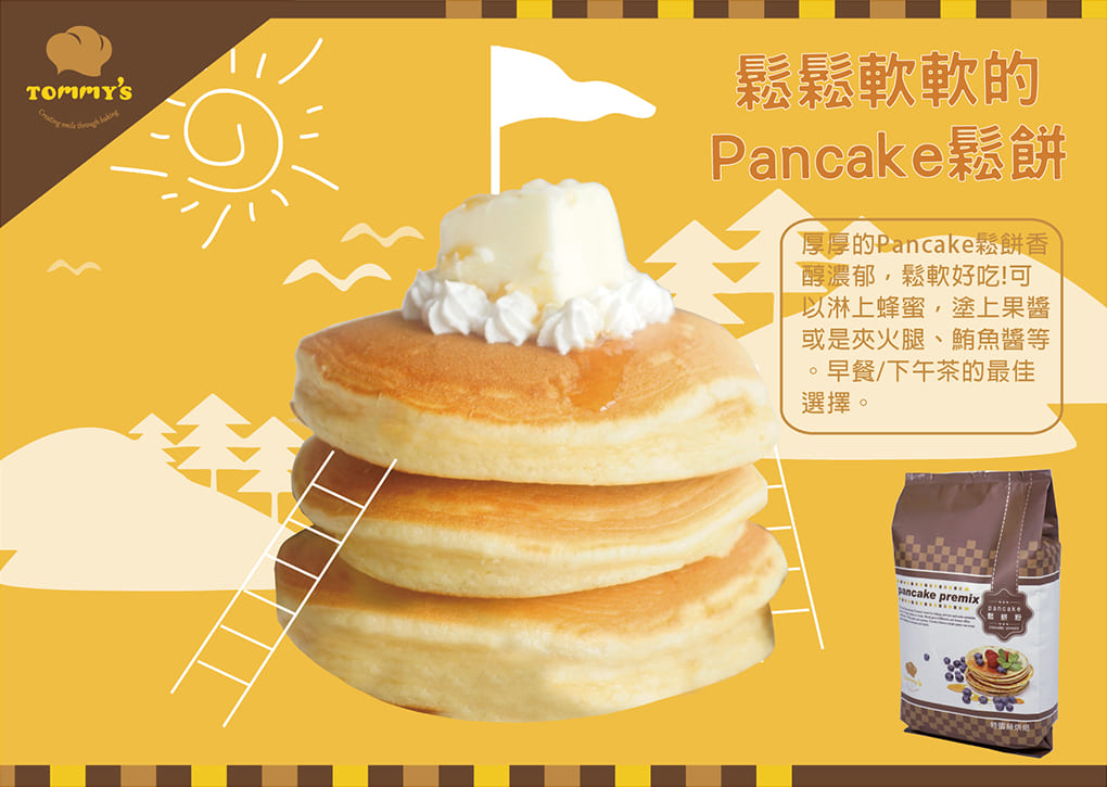 用Pancake鬆餅粉做出的鬆餅味道香醇濃郁,組織濕潤不乾口,不需使用特別的模具,利用家中的平底鍋就能做出時下流行的厚片鬆餅,講究的您也可以淋上蜂蜜,塗抹果醬一起食用,想吃鹹食的話可以在兩片Pancake鬆餅的中間夾火腿、鮪魚等鹹餡食用,Pancake鬆餅可以是您早餐的第一選擇,也可以是您下午茶的最佳伴侶。