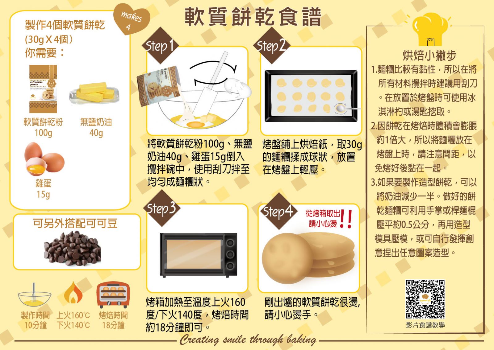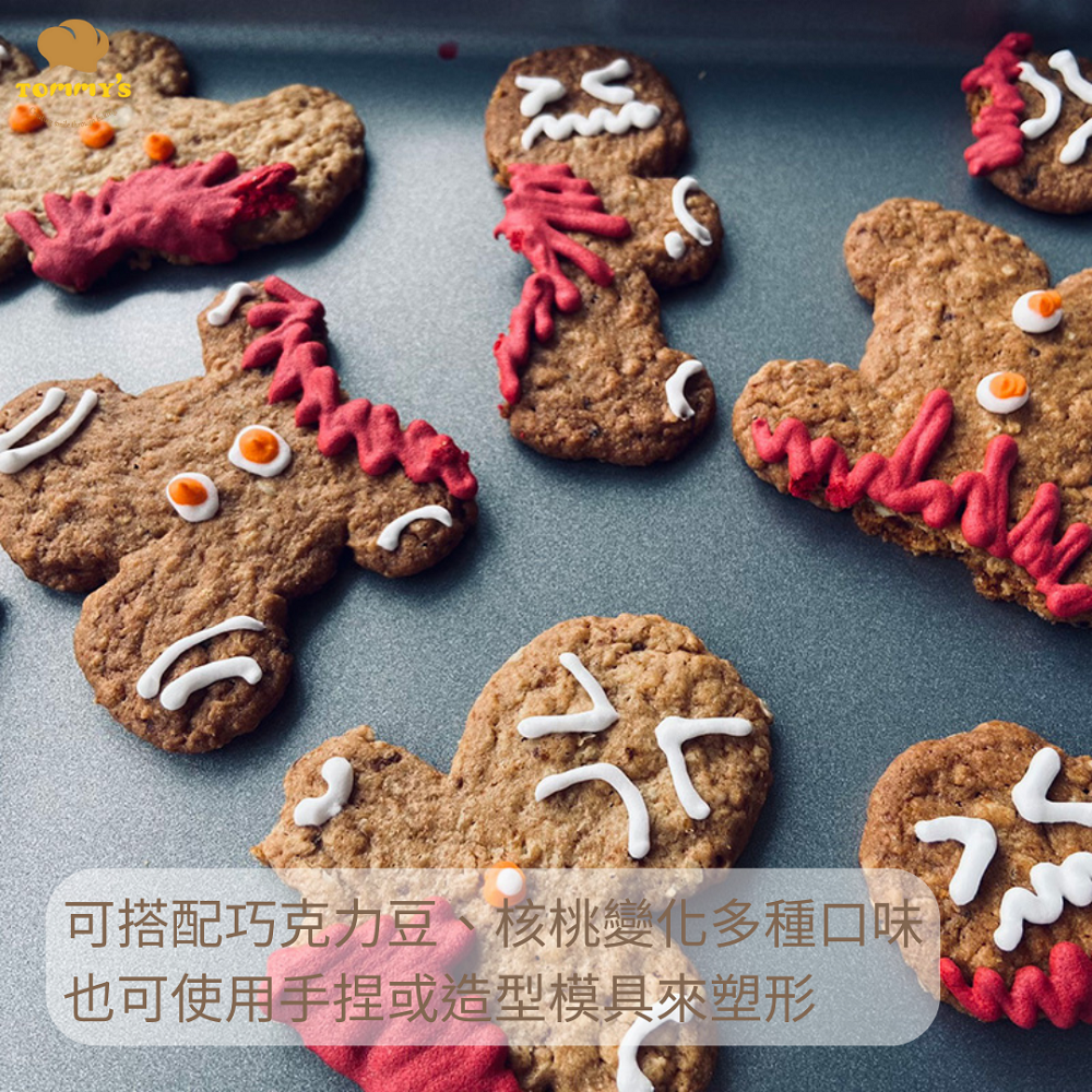本產品內富含麥片之纖維質,健康無負擔。軟質餅乾粉製作輕鬆簡單,在製作過程中可搭配耐烤巧克力豆、核桃等產品,變化多種口味,是一款適合親子共同DIY的點心。想讓產品有更多變化,可以自行捏出造型圖案,或使用造型模具,在烤焙前先將麵糰塑型後烘焙,造型不僅可愛且好吃又好玩。