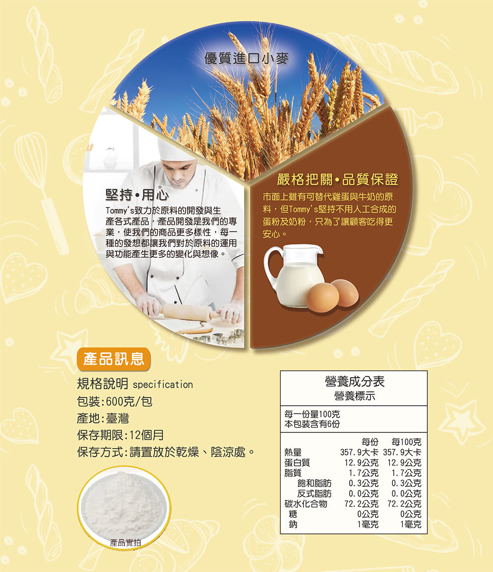 小麥麵粉、羥丙基澱粉、小麥蛋白、樹薯澱粉、維生素C、麥芽糖、麥芽低聚醣、磷脂酵素、澱粉液化酵素、糊精、聚木糖酵素