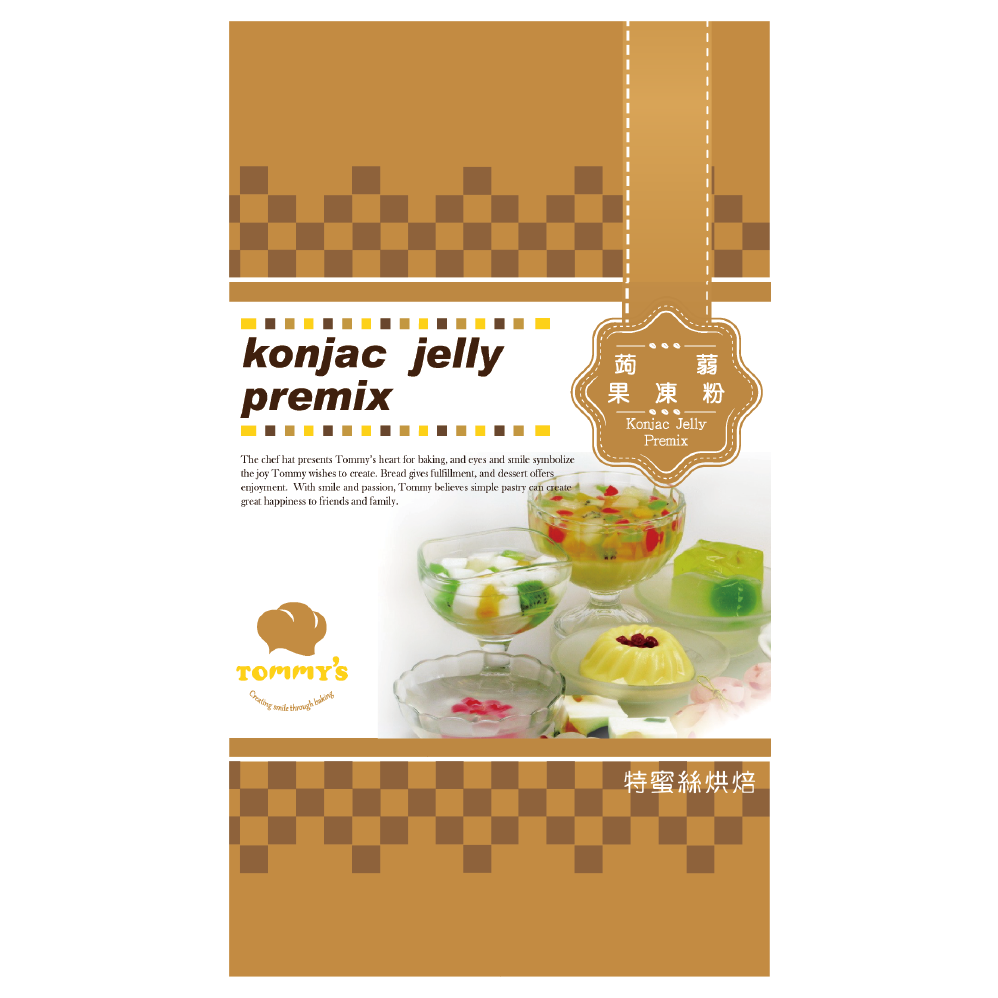 軟Q有口感。蒟蒻果凍粉內含有高纖維蒟蒻,是一款健康、低熱量的產品。蒟蒻果凍粉可在製作過程中加入果汁調味,當成小朋友們的日常點心,也可以和飲料一起搭配食用,別有一番風味。