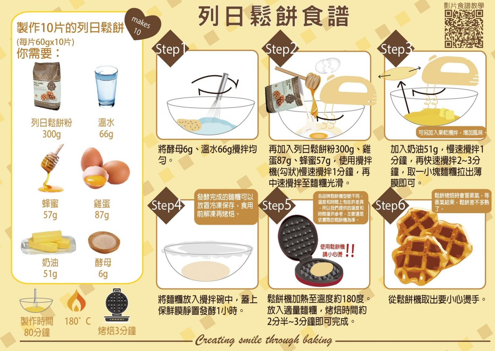 列日鬆餅是一種需要經過發酵而成的鬆餅,透過發酵的過程而產生的特殊香氣類似麵包香,麵糰經過烤焙後可呈現外皮酥脆、內部紮實的Q彈感。