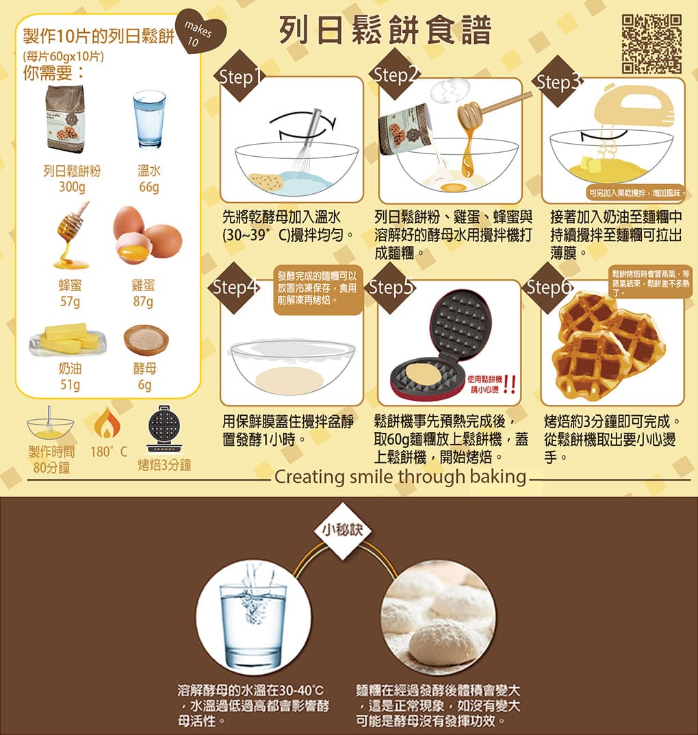溶解酵母的水一定要用溫水,如用太高或太冰溫度的水,酵母會失去功用,所以水的溫度約30~40℃。