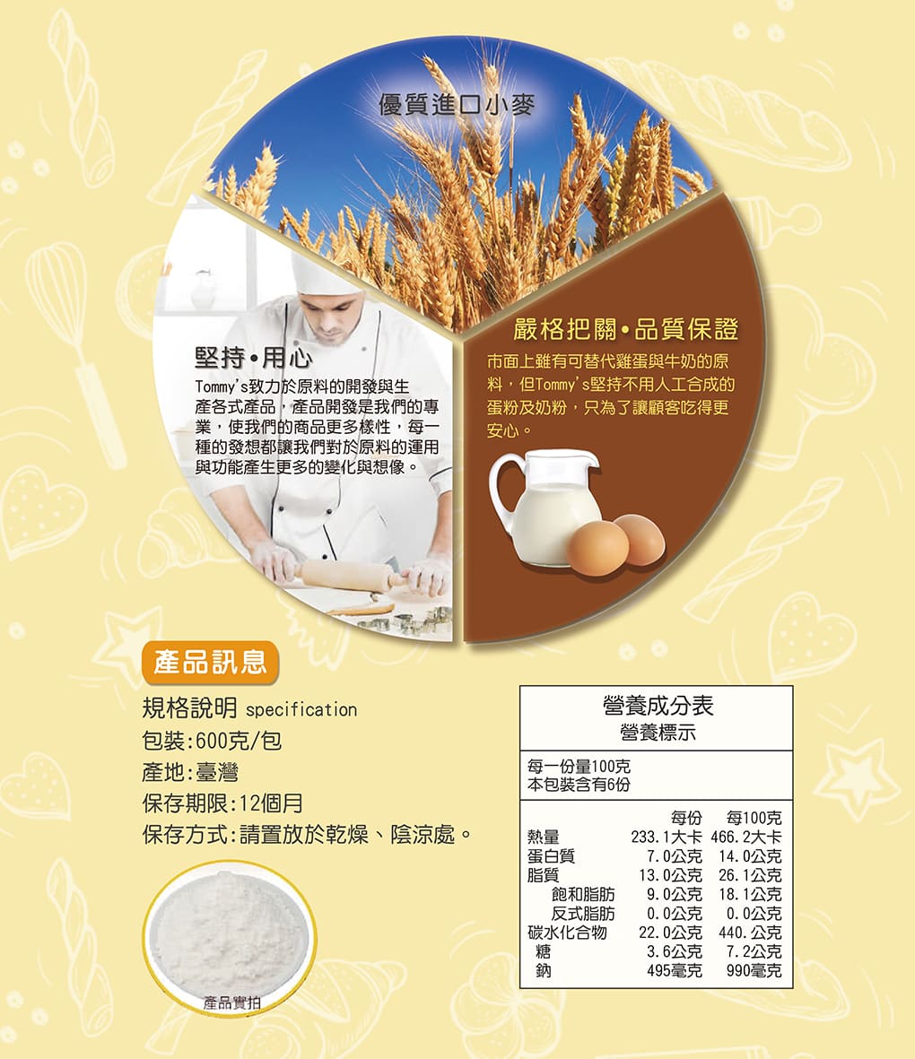 羥丙基澱粉、糖、麵粉、全脂奶粉、醱粉(酸性焦磷酸鈣、碳酸氫鈉、小麥澱粉、磷酸二氫鈣)、鹽、小麥澱粉、乳化劑(乳酸硬脂酸鈉、脂肪酸甘油酯)、黃豆粉、檸檬酸。