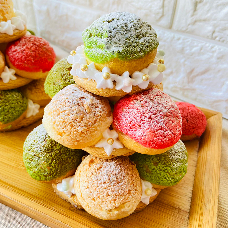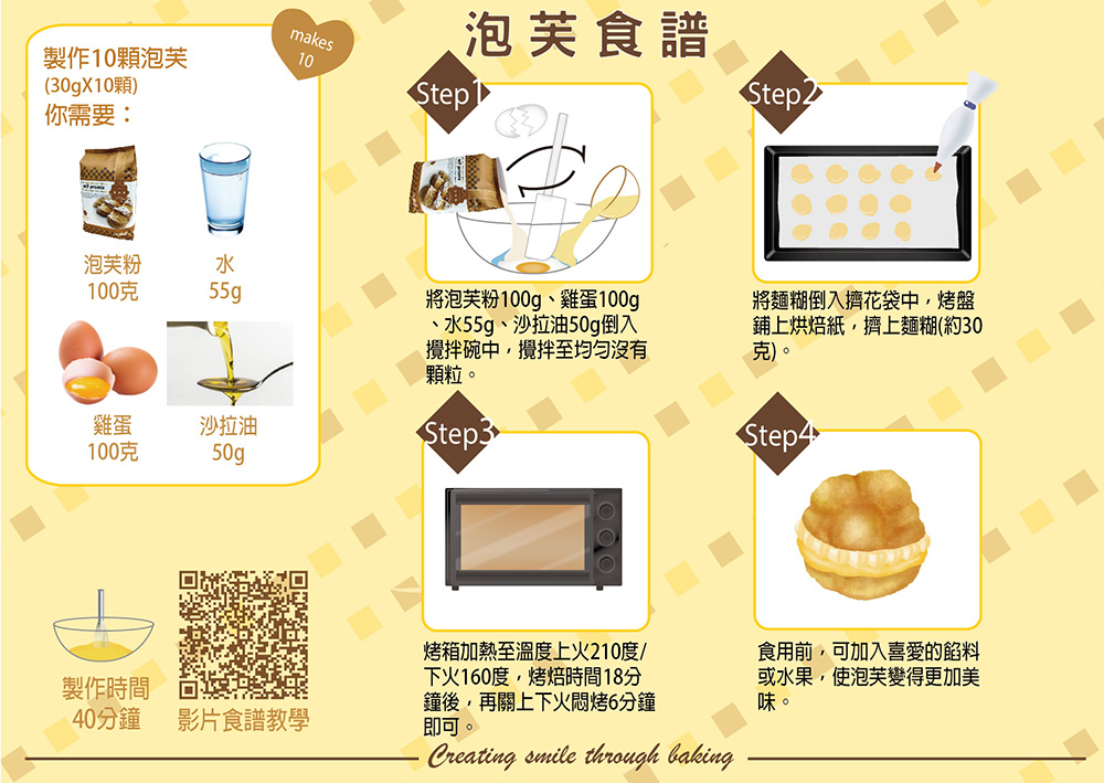 在製作過程中也可依照喜好搭配杏仁顆粒、巧克力/栗子泥、草莓等內餡;或用花嘴擠出不同造型,變化成多種款式。 是一款適合親子DIY好吃又好玩的點心。